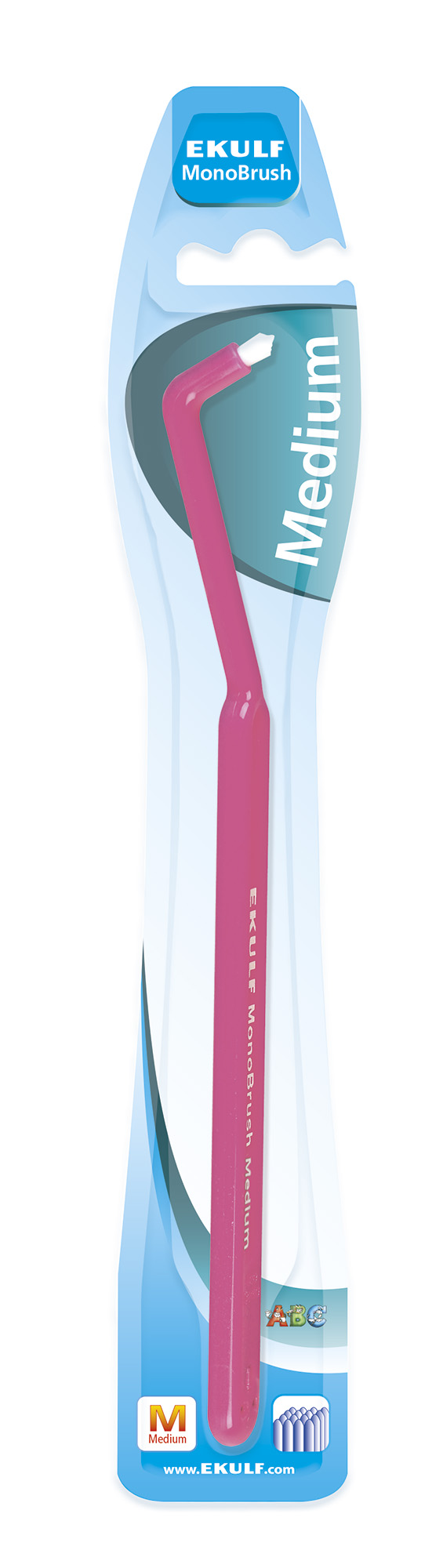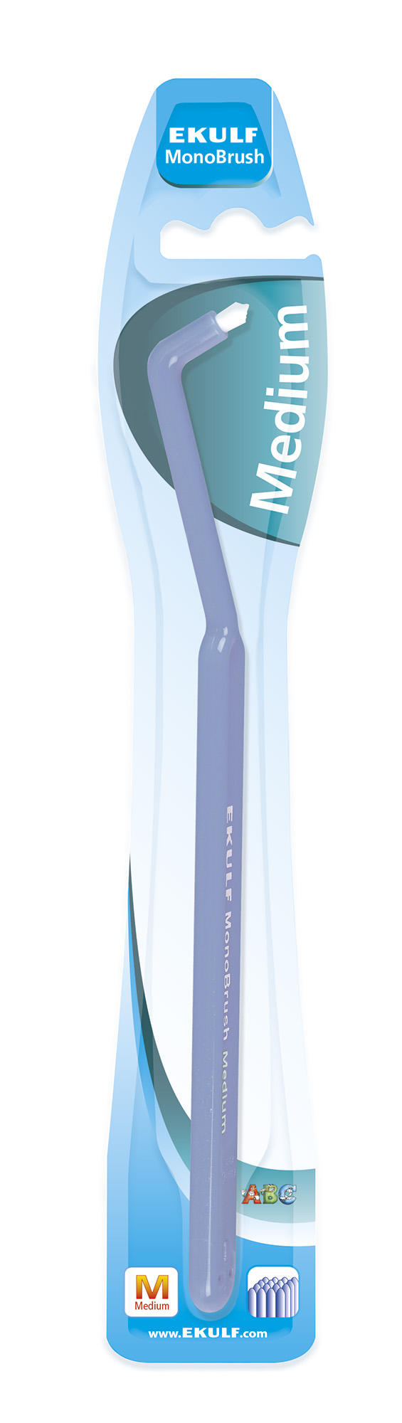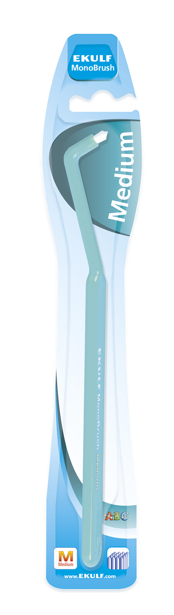 EKULF MonoBrush er en vinklet tandbørste med et lille, kompakt børstehoved og bløde, afrundede børstehår, der giver skånsom men effektiv rengøring. Den er særligt udviklet til at forbedre mundhygiejnen hos personer med særlige behov og er ideel til rengøring omkring tandbøjler, visdomstænder, implantater, broer, proteser og fæster til delproteser. Den vinklede hals gør det nemt at komme til langs tandkødskanten, mellem tænderne og på børns kindtænder. MonoBrush er et fremragende supplement til den daglige tandbørstning.