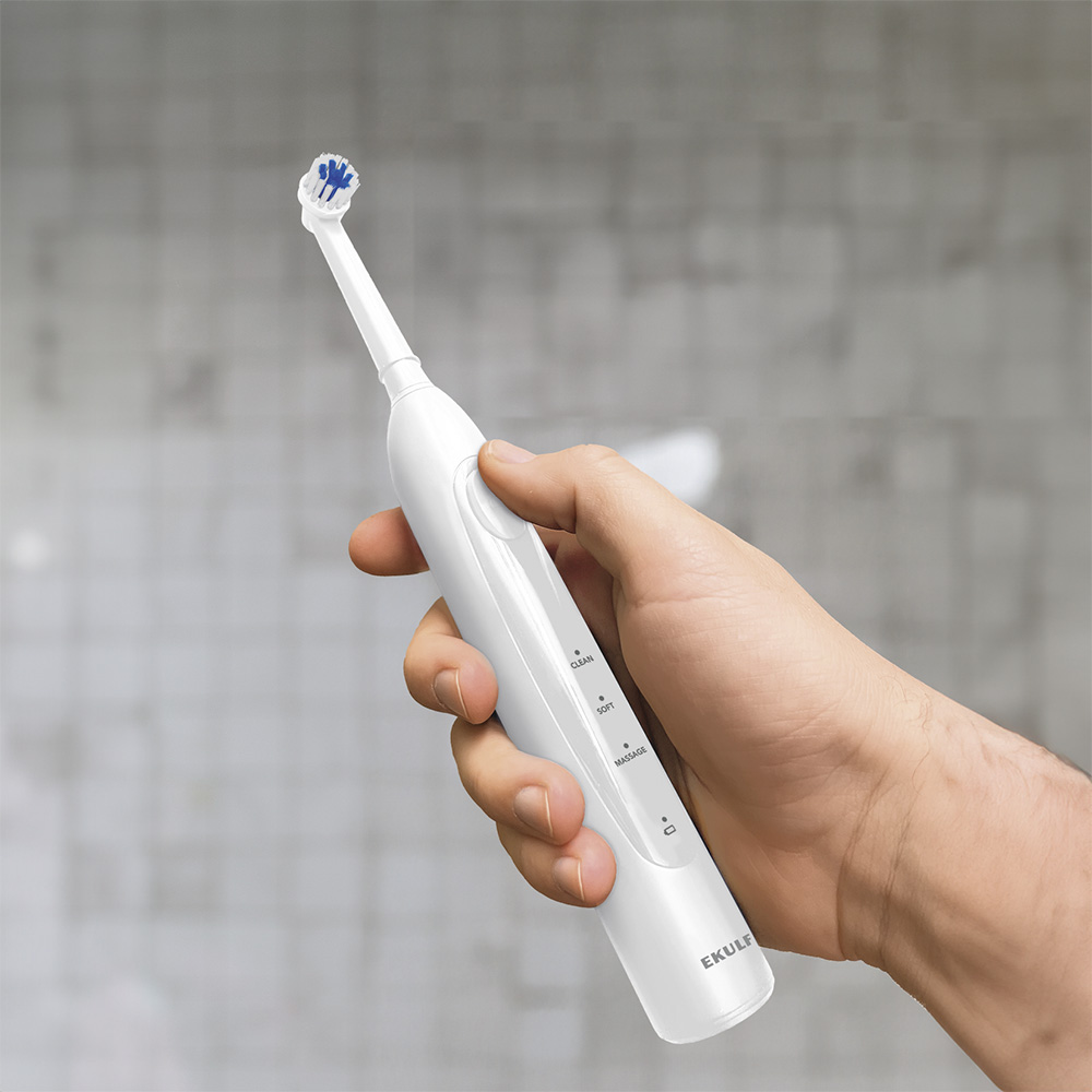 Tandbørsten har et lille, rundt børstehoved, der når hele tanden. Børstehovedet er designet til at nå selv de svært tilgængelige områder mellem tænderne og fjerner effektivt plak. EKULF Oscillating PowerBrush tilbyder flere rengøringsindstillinger for at imødekomme dine individuelle behov. Vælg mellem CLEAN, SOFT og MASSAGE for en skræddersyet og skånsom rengøring. Med op til 8800 børstestrøg pr. minut leverer EKULF Oscillating PowerBrush kraftfuld rengøring for sundere tænder.